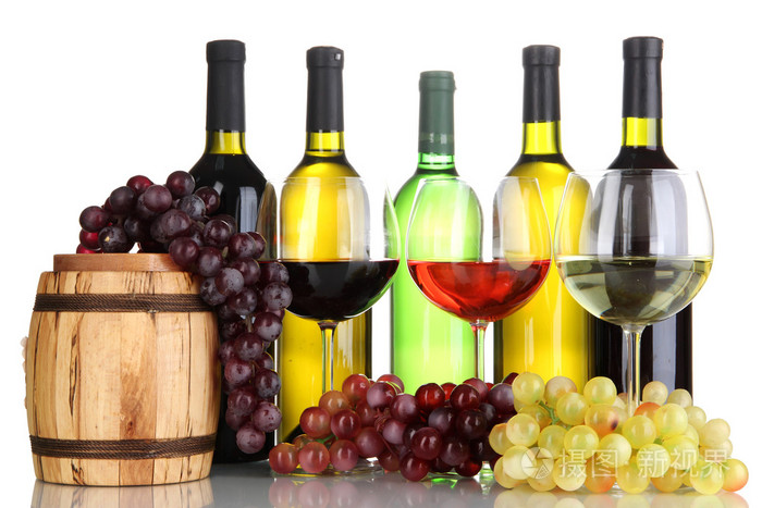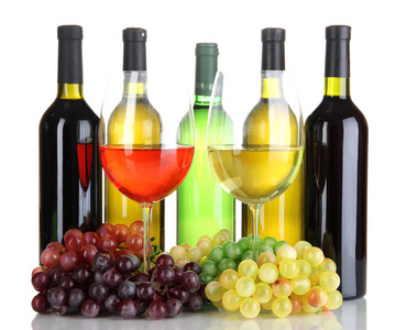 瓶子和眼镜的葡萄酒和葡萄,孤立在白色的分类