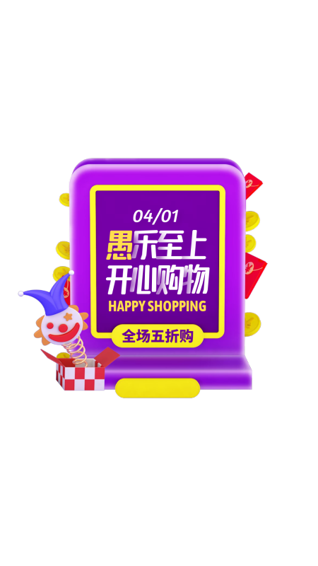 紫色C4D立体愚乐至上开心购物弹窗广告