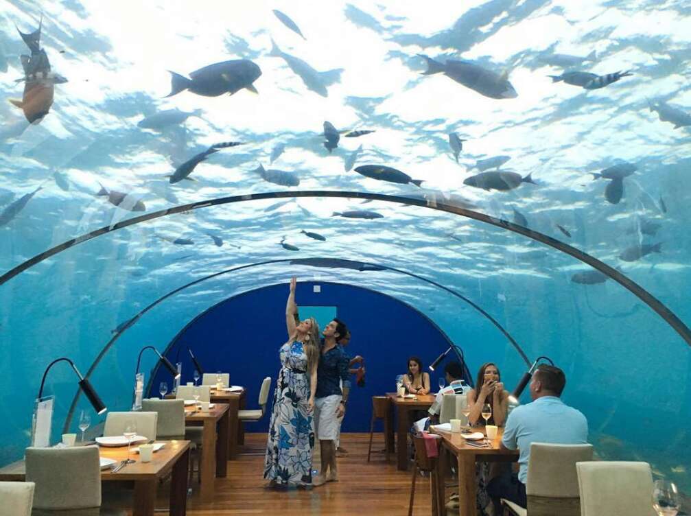 马尔代夫海底餐厅形似水族馆 鲨鱼海龟陪伴客人用餐