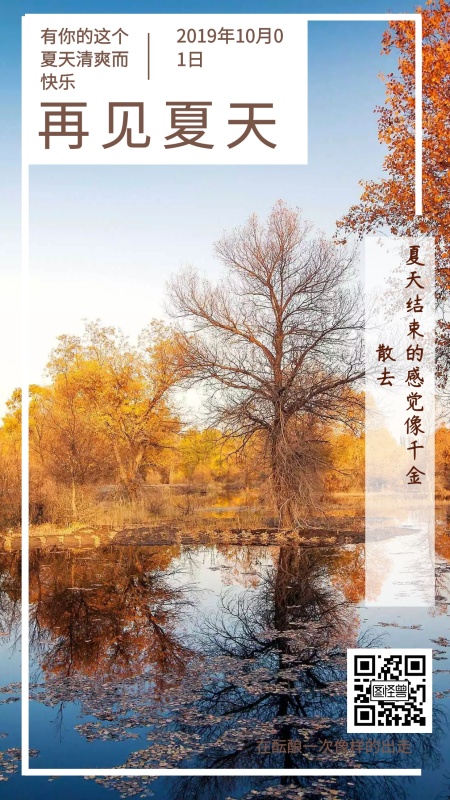 再见夏天 夏天结束的感觉像千金散去 在酝酿一次像样的出走 有你的这个夏天清爽而快乐 2019年10月01日 十月你好日签
