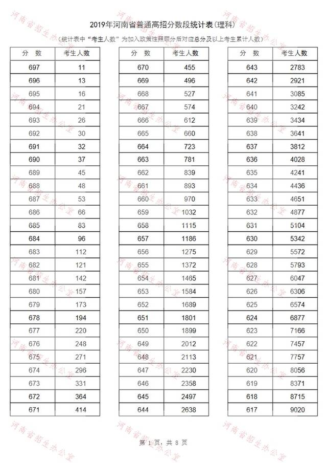 2015河南高考分数段排名统计表理科2015