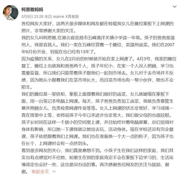 案板下学习的7岁女孩妈妈发声:有点愧疚!