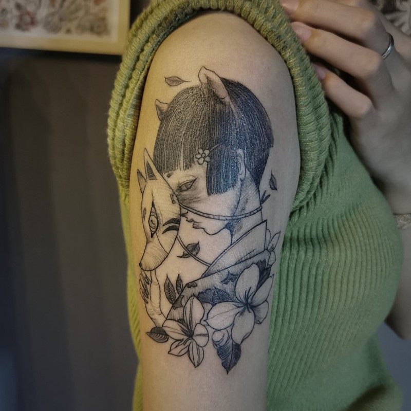 古典油画般的彩绘艺妓扑克牌大臂纹身图案