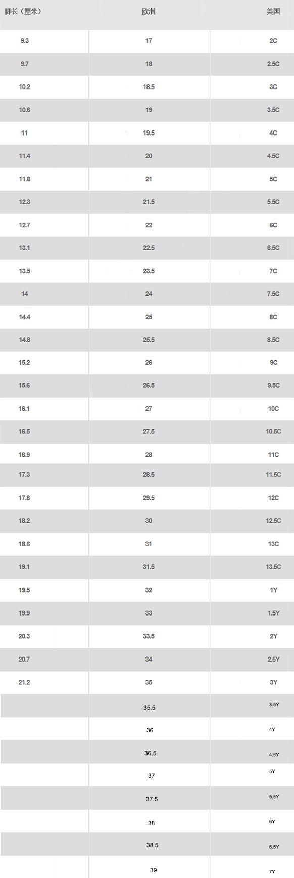 美版海淘asics儿童鞋尺码对照表 gel lyte v