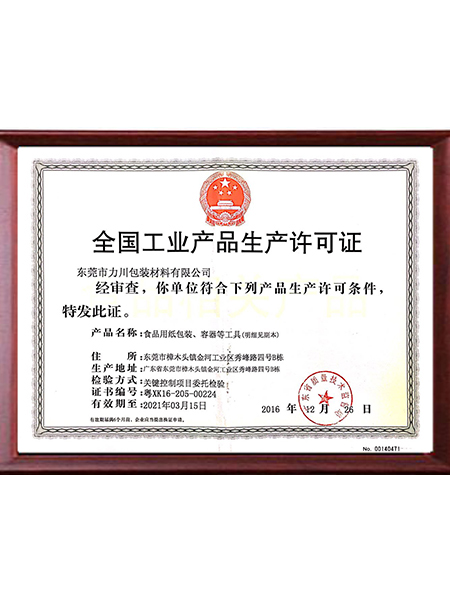 全国工业产品生产许可证-东莞市力川包装材料有限公司