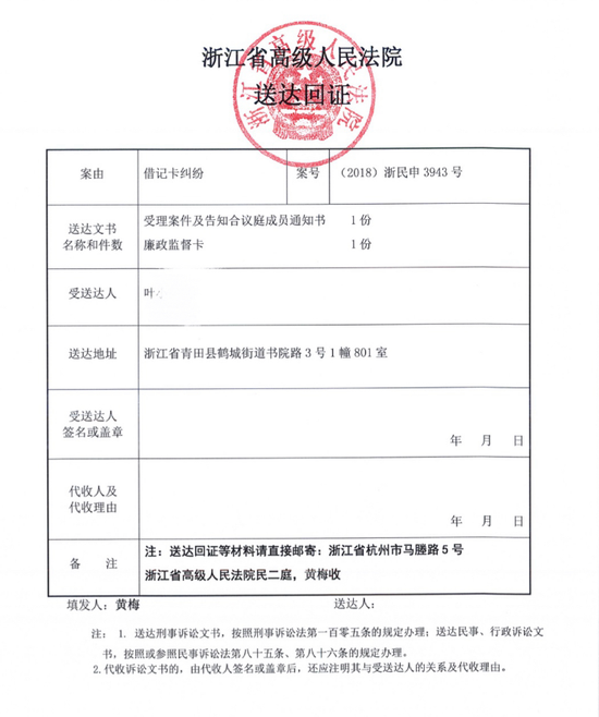 浙江高院的再审受理的送达回证