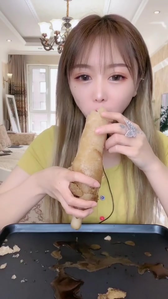 可爱小姐姐直播吃百香果海绵冰,一口咬