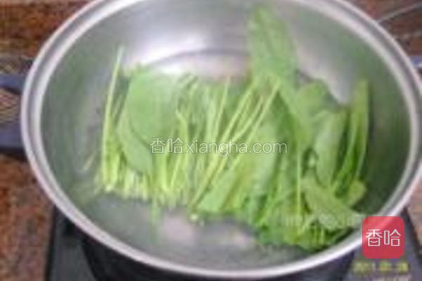 千张焯水烫熟捞出,菠菜焯水去除草酸备用。
