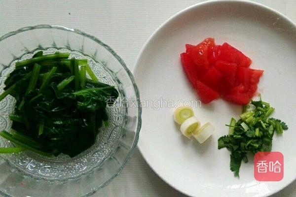 菠菜焯水去除草酸 西红柿去皮切小块 切葱花 香
