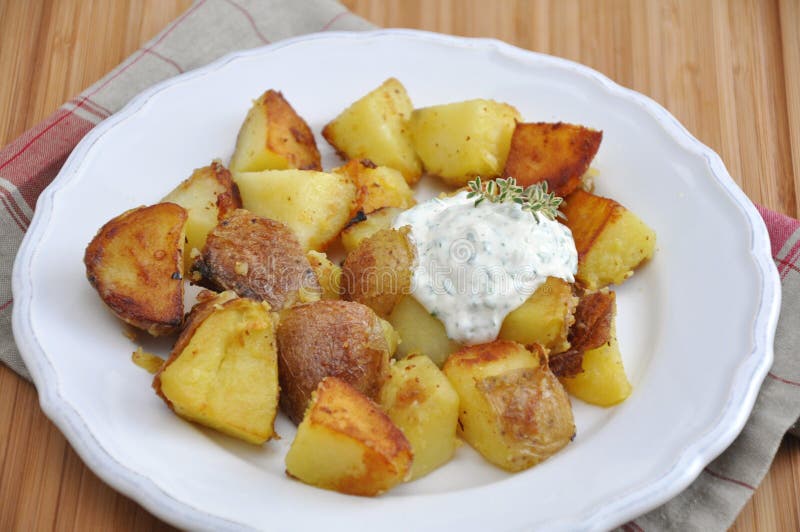质朴的烤箱烤土豆配迷迭香。木制的背景