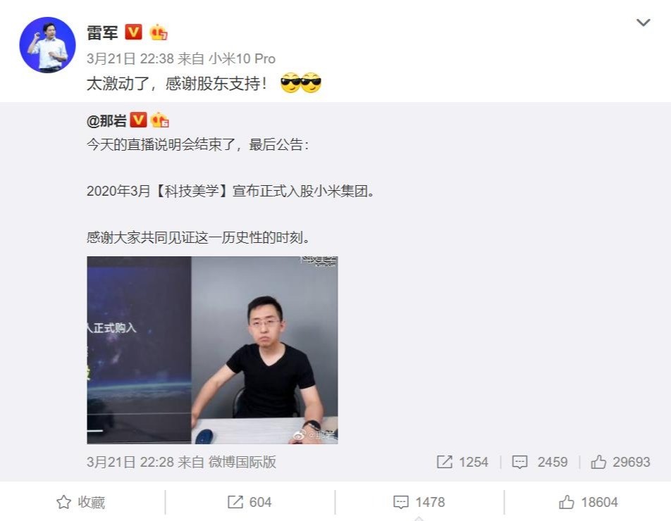 科技美学那岩入股小米 雷军:很激动 感谢