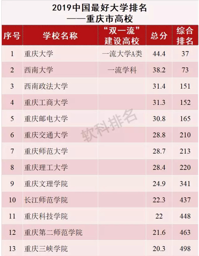 2019年西南地区大学排名情况一览!_重庆