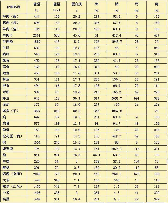 常见食物每 100 g 中能量、蛋白质、钾、钠