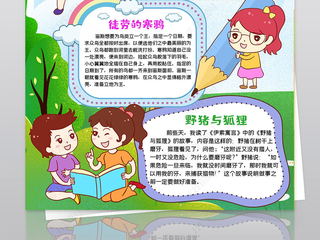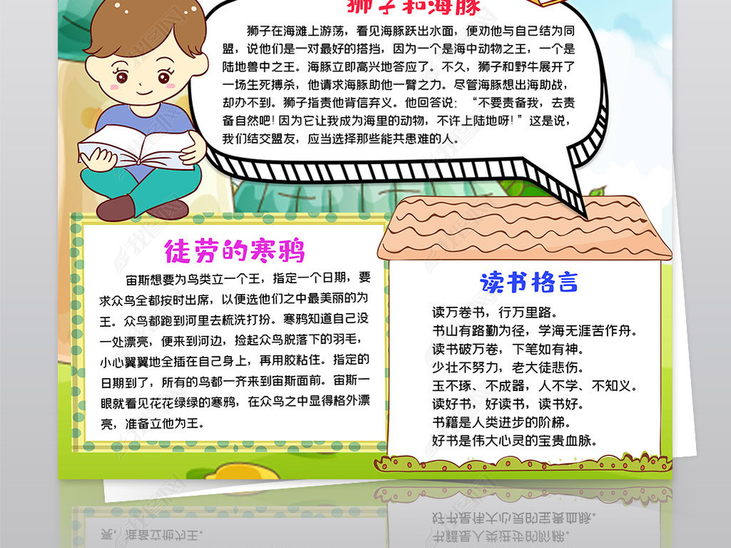中国寓言故事小报模板爱读书线描手抄报素材