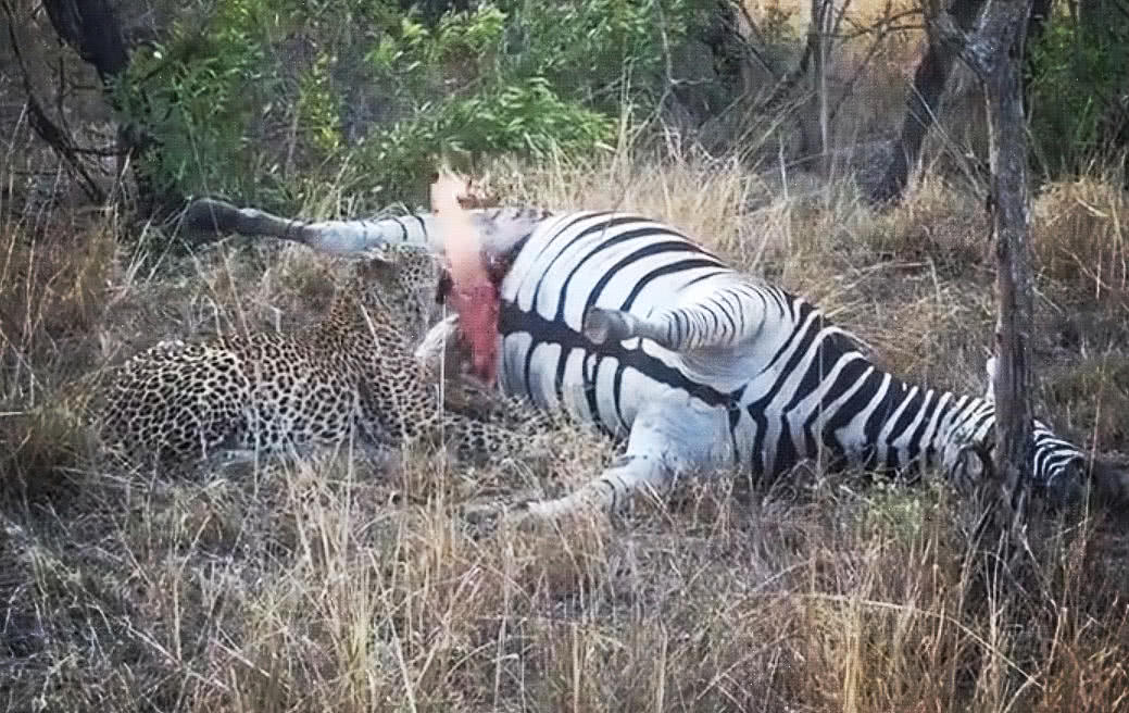 豹子咬破巨人观斑马,肚皮爆炸喷一嘴尸水,