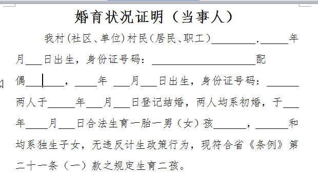 二胎婚育证明模板|单独二胎婚育证明(书写
