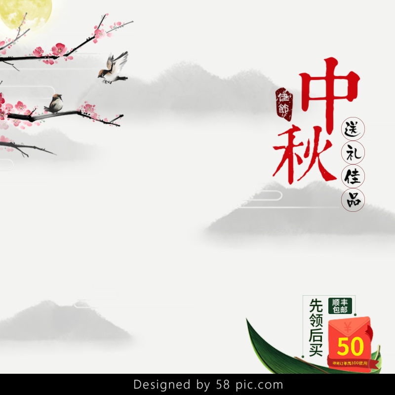 水墨色中国风月亮梅花小船中秋电商淘宝主图