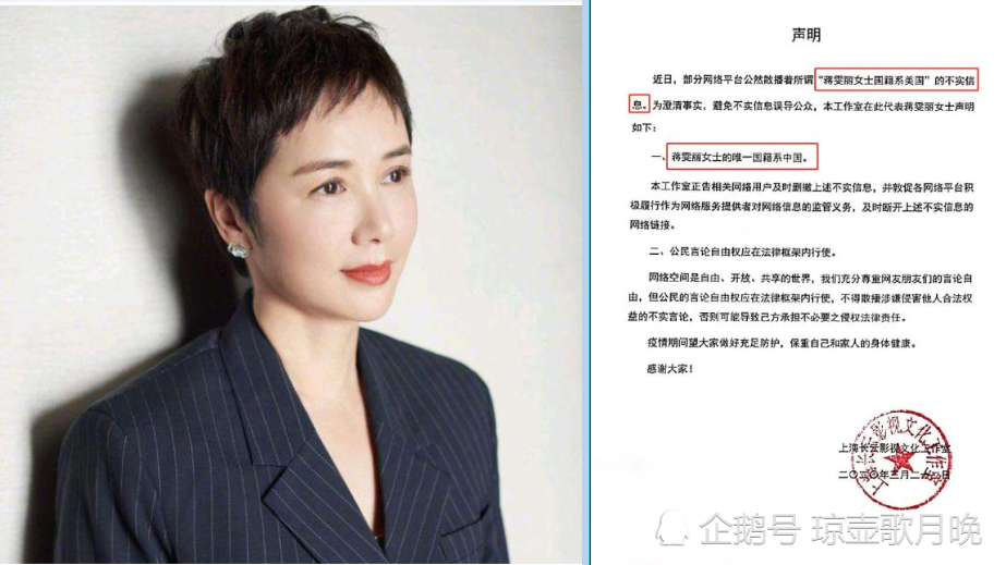 蒋雯丽发表声明否认自己是外国国籍,网友