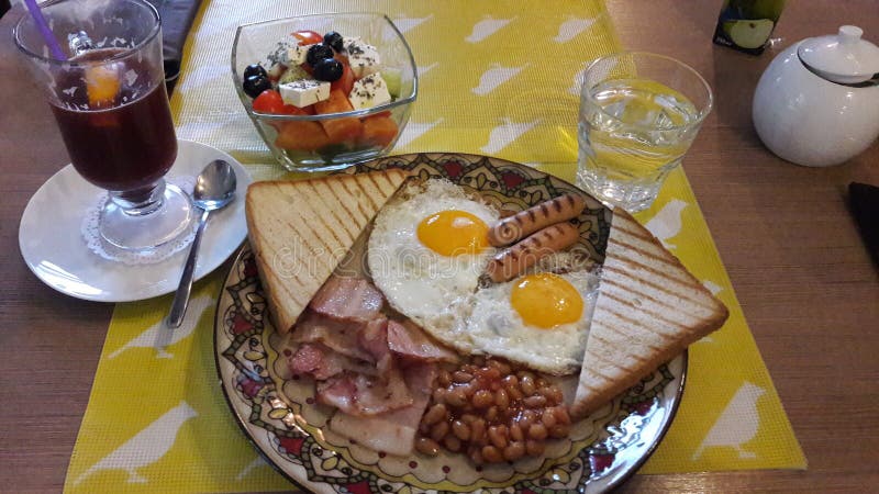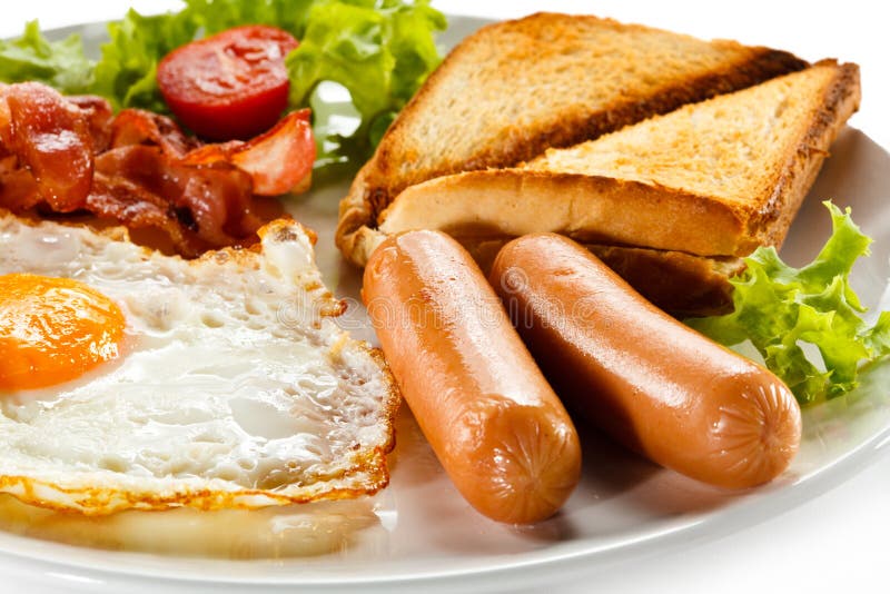 英语早餐配煎蛋, 香肠, 土司和新鲜的萨尔