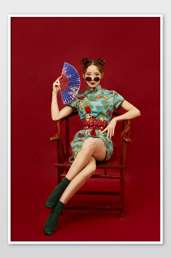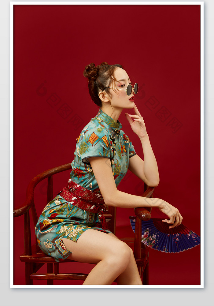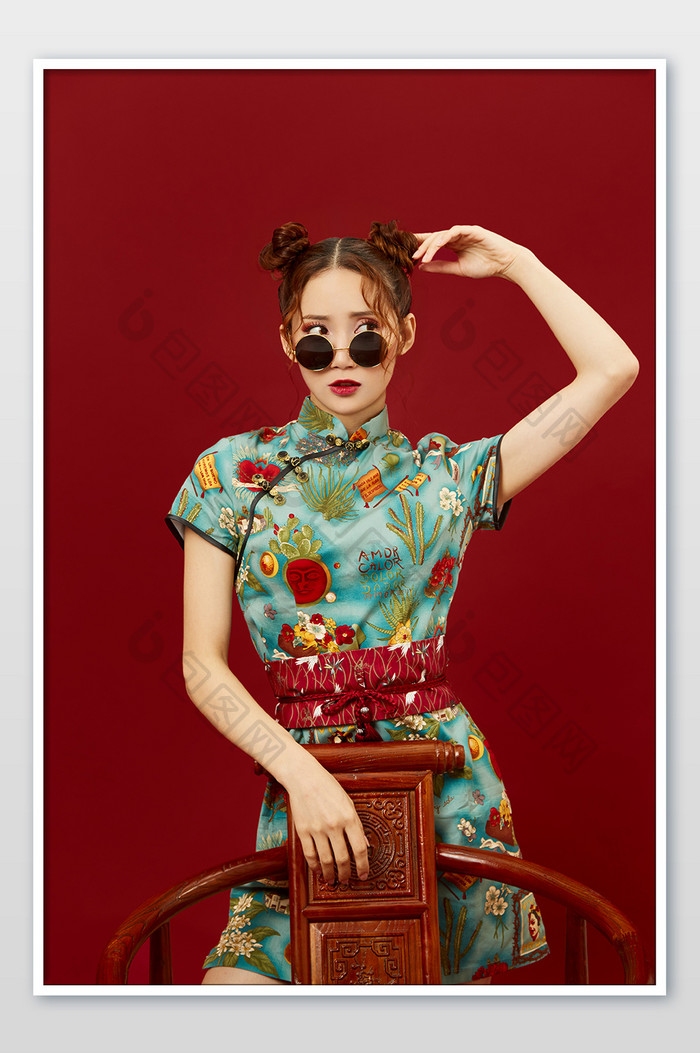国潮丸子头美女旗袍中国风墨镜时尚写真