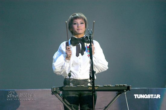 组图:何韵诗演唱会以歌会友 造型滑稽又