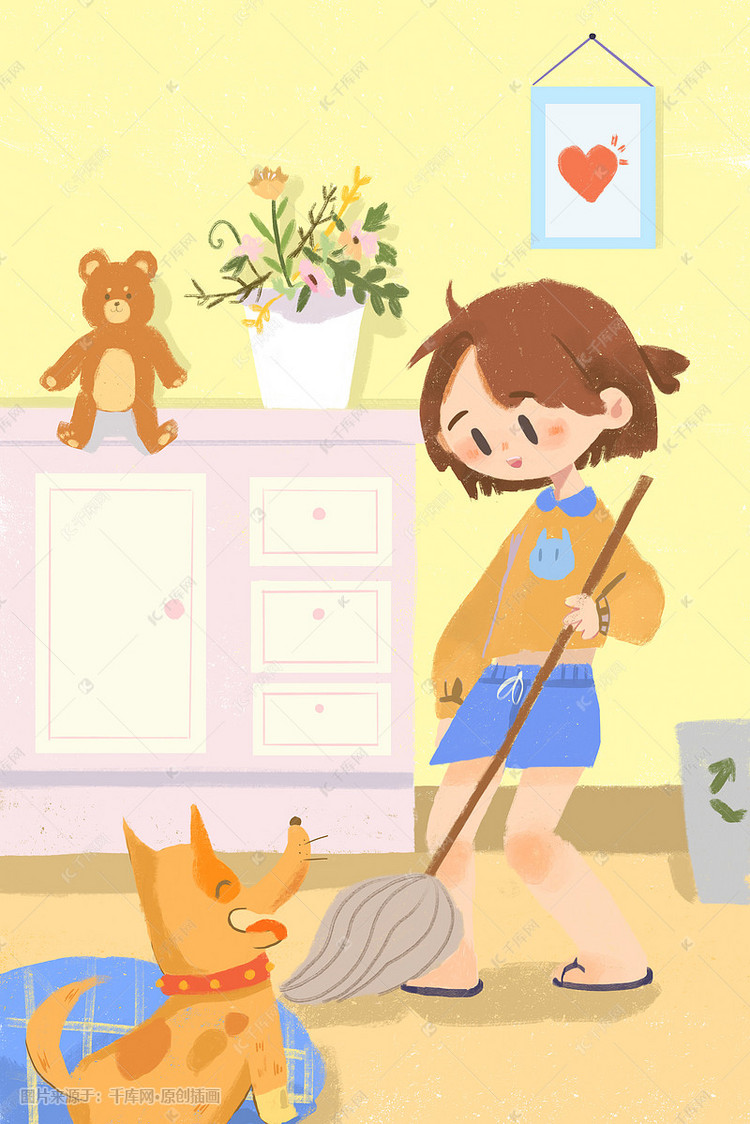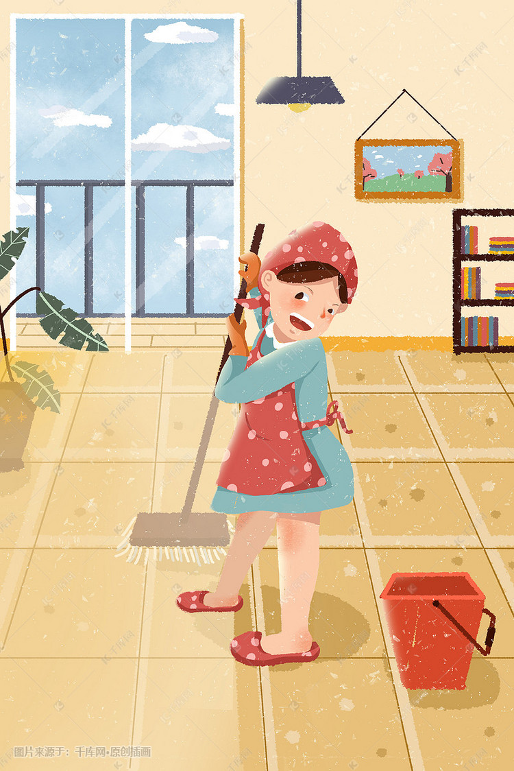 51劳动节少女劳动打扫卫生大扫除室内插画图片