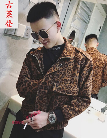 港风文艺社会精神小伙翻领豹纹夹克2019