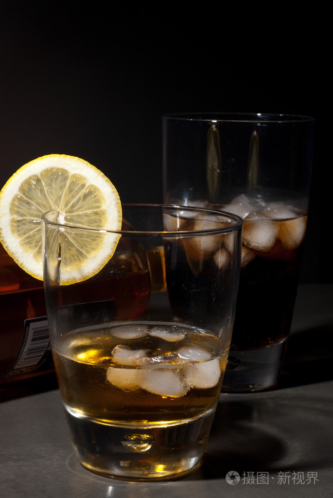 杯威士忌酒和可乐加冰块