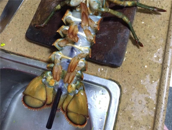 服务员用筷子插进龙虾的尾部,然后龙虾尿