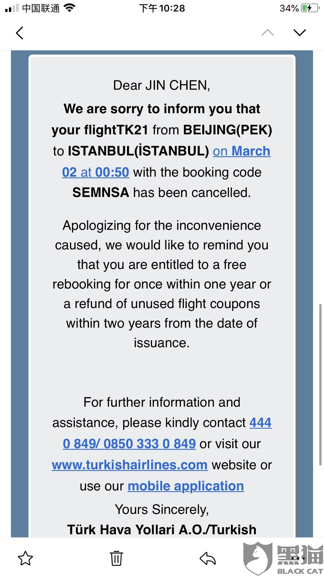 要求土耳其航空公司退机票