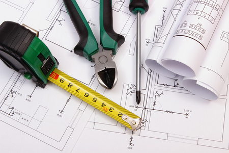 工作工具、 电熔丝或施工图的房子图卷