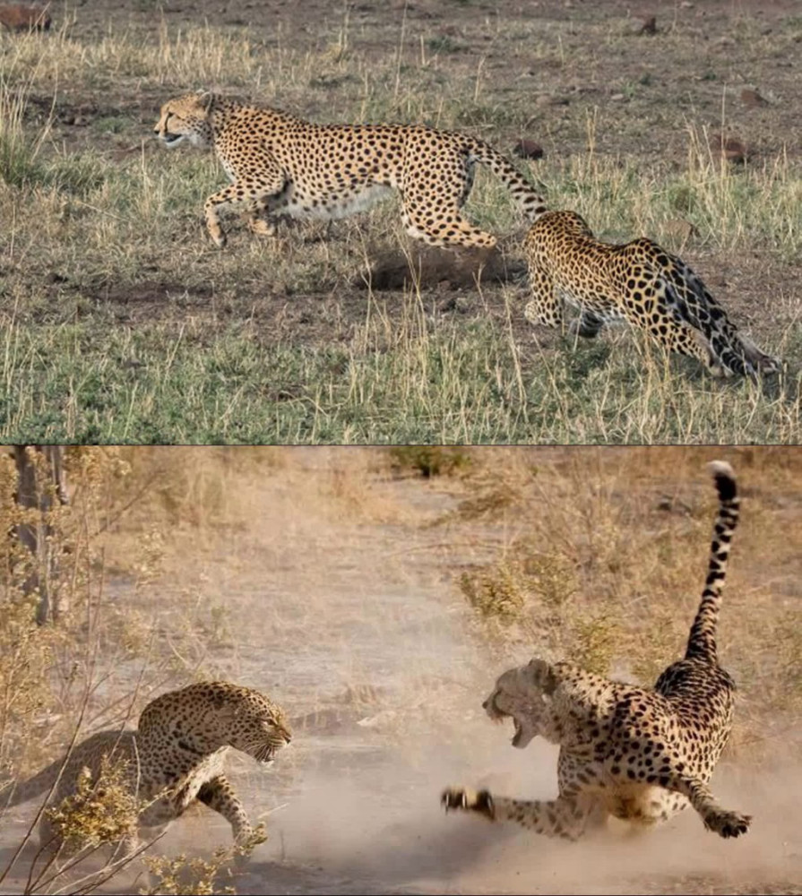 花豹猎豹相争,母猎豹引花豹追击以便保护