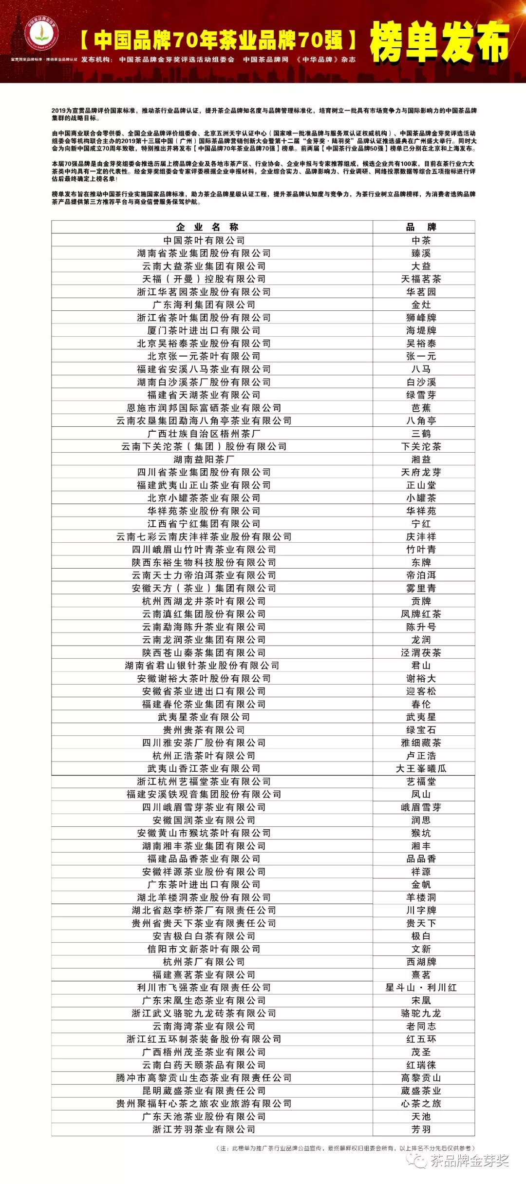 2019【中国品牌70年茶业品牌70强】榜单
