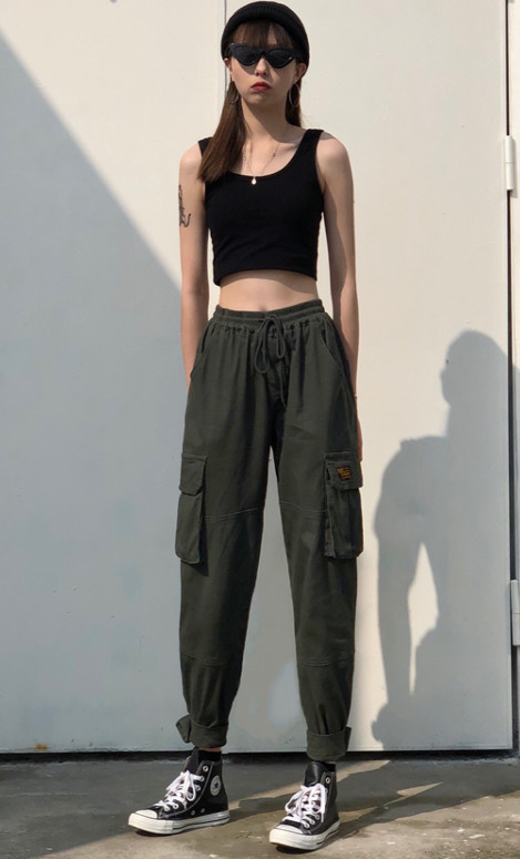 DARLINGAGA 嘻哈风hiphop绿色口袋ins工装裤女宽松显瘦束脚休闲裤- 天天惠
