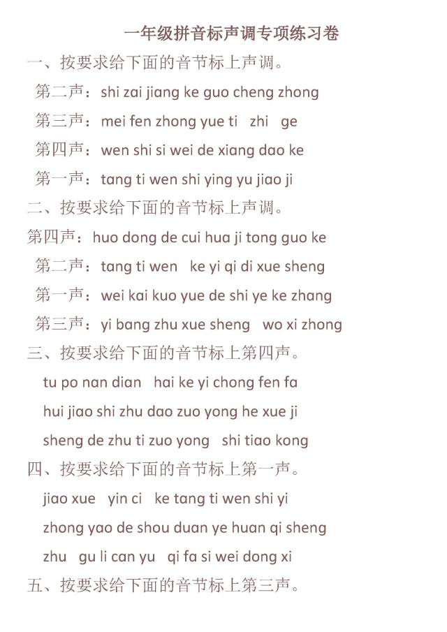 小学一年级拼音标声调专项练习卷