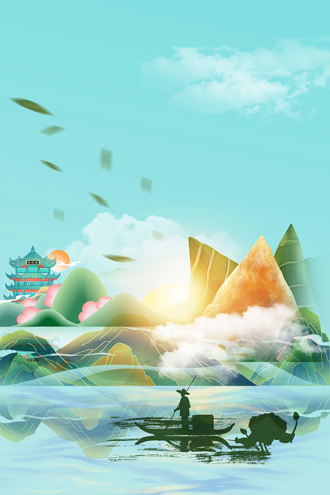 清新卡通手绘插画粽子端午节龙舟海报背景