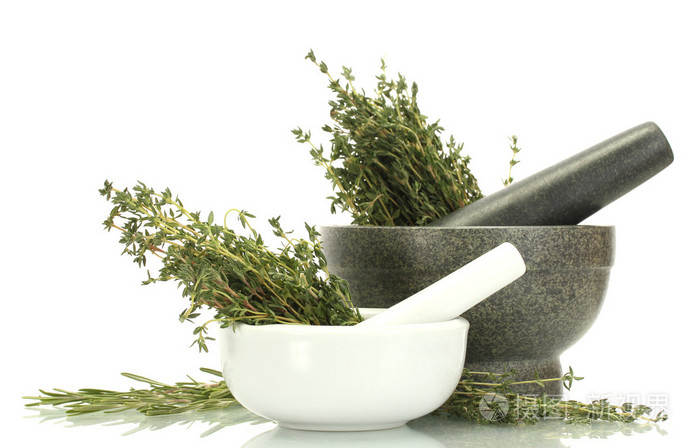 迫击炮与新鲜绿色百里香和迷迭香白隔离