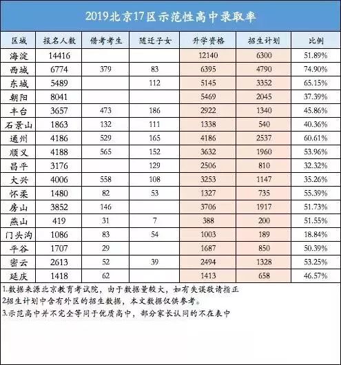 北京17区普通高中和示范高中录取率!东西