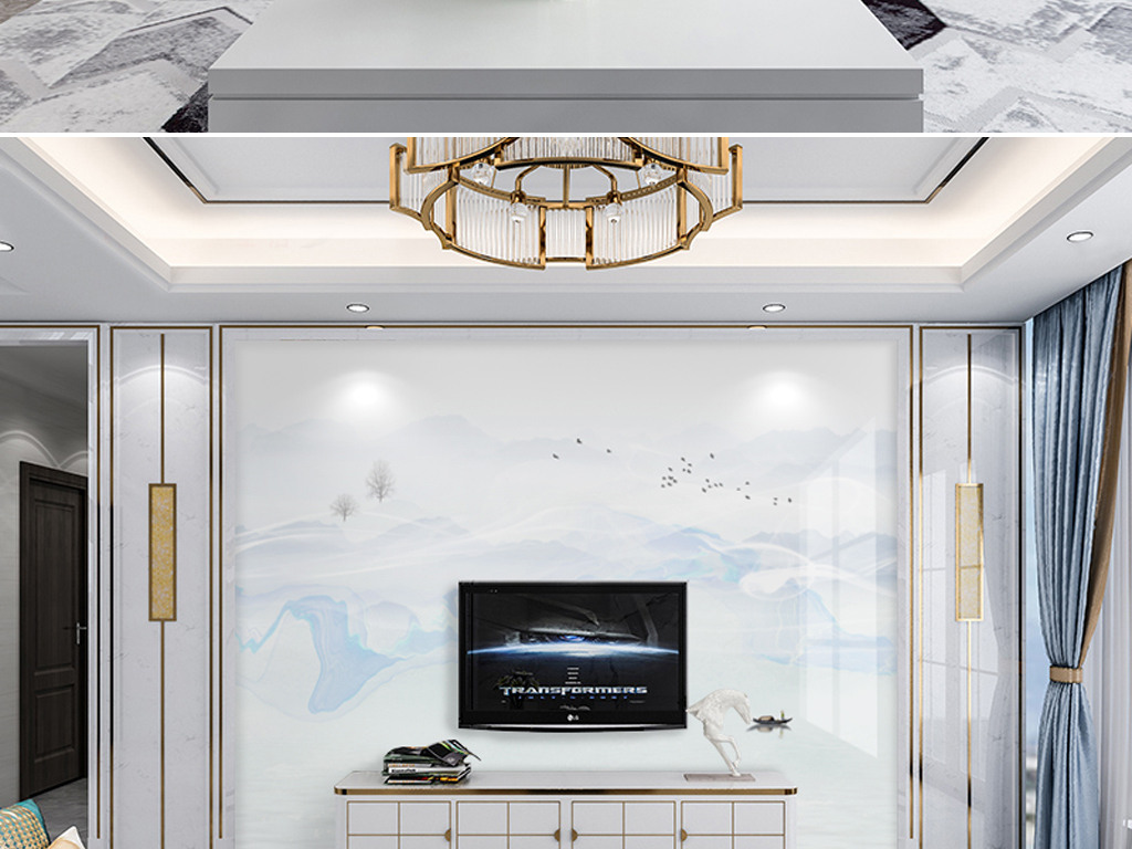 高档大气浅蓝色意境山水石材大板轻奢背景墙
