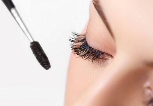 美丽的年轻女子,在她的脸化妆刷上应用基础