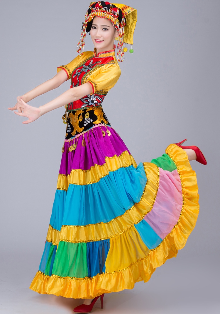 新款吉祥谣藏族舞蹈服开场舞台服饰西藏水袖长袖少数民族装大摆裙
