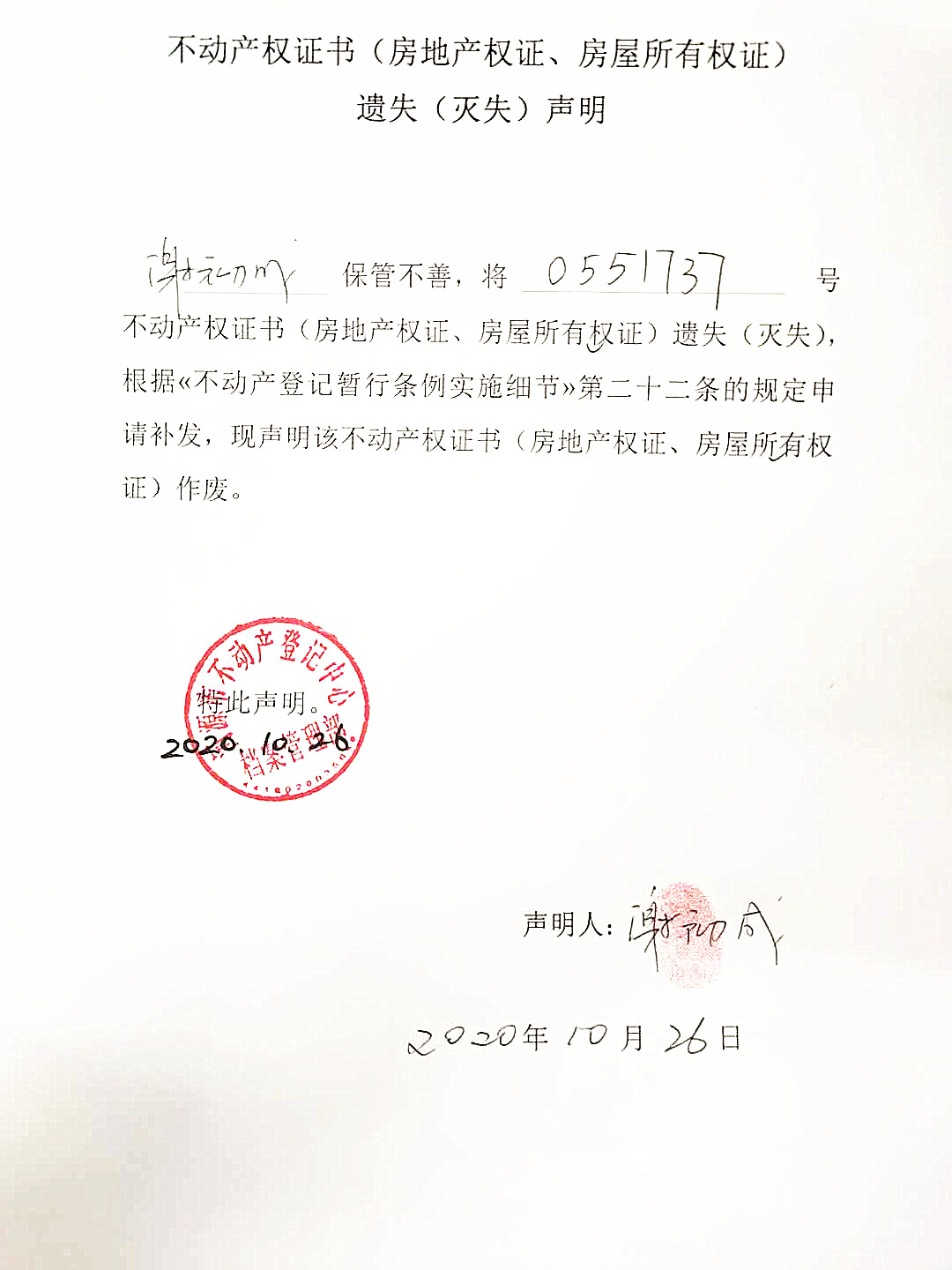 不动产权证书(房地产权证、房屋所有权证)遗失(灭失)声明