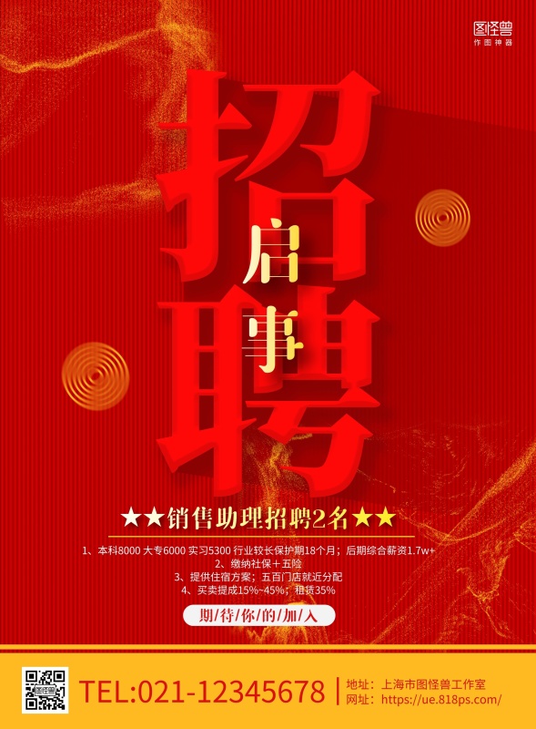 红色简约销售助理招聘宣传海报