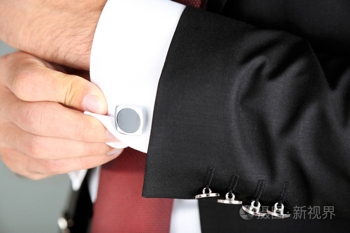 男人做领扣,在灰色的背景上