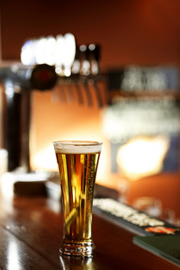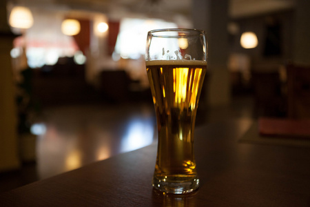 酒吧的桌子上放杯新鲜的生威斯啤酒生啤