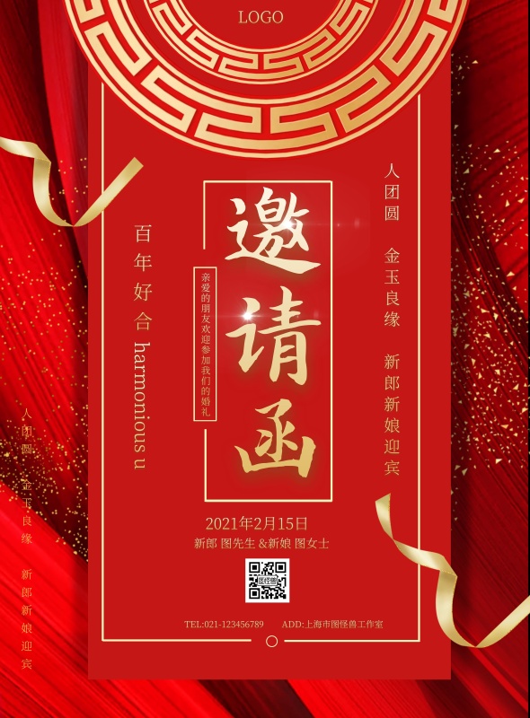 婚礼邀请函红色结婚在线海报制作竖版海报