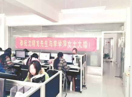 武汉公司挂横幅庆员工结婚 网友惊呼好有爱
