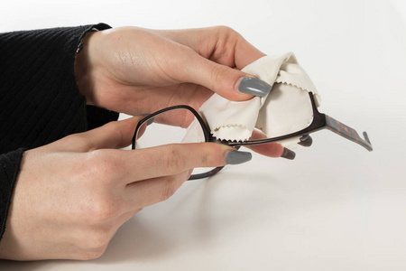 手妇女清洁她的眼镜, 干净的眼镜镜片, 选择