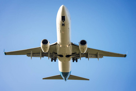 低角度视图的窄体客机飞机在云层与收回