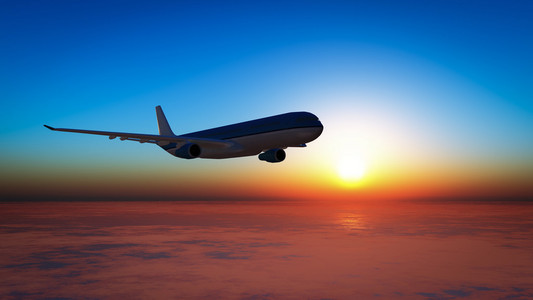 商用飞机飞过大海日落时分